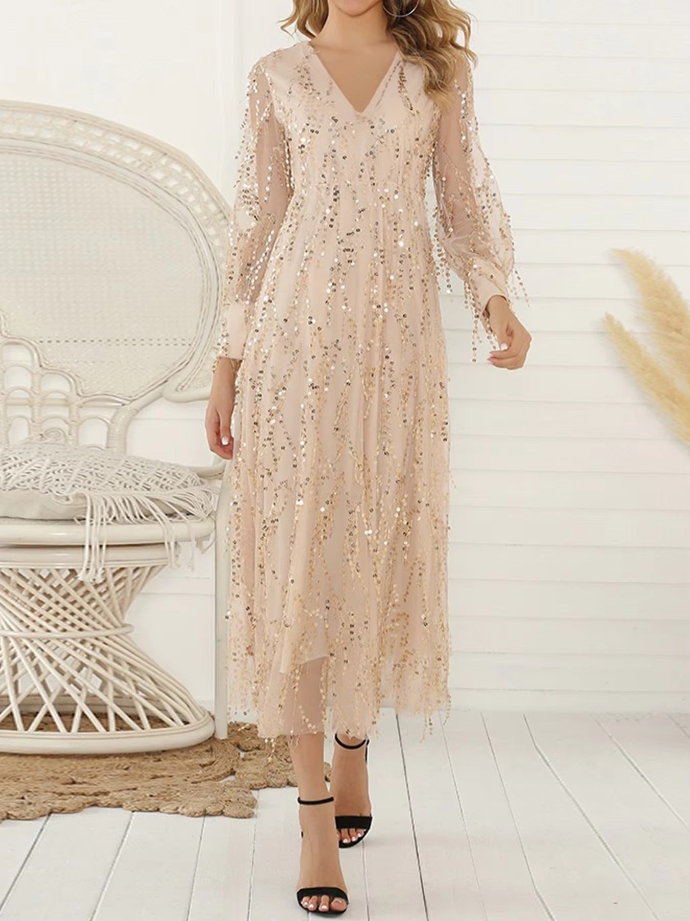 Elevate your evening wardrobe with this sophisticated long dress, designed for those who appreciate refined elegance. The flattering V-neckline and flowing long sleeves create a graceful silhouette, while intricate sequin detailing and delicate fringe accents add glamorous dimension. Perfect for formal dinners, upscale celebrations, and special occasions, this piece combines timeless style with contemporary flair. The extended length ensures a polished, dramatic presence that commands attention while maintaining understated sophistication.